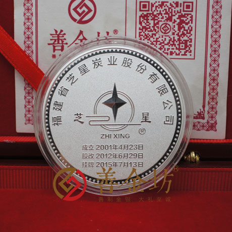 正面圖案:鐫有“福建省芝星炭業(yè)股份有限公司”、 “成立2001年4月23日 股改2012年6月29日 掛牌 2015年7月13日”等字樣及l(fā)ogo圖案。背面圖案:鐫有 “全國(guó)中小企業(yè)股份轉(zhuǎn)讓系統(tǒng)”、“上市紀(jì)念”、“公司簡(jiǎn)稱(chēng) 芝星炭業(yè) 股票代碼 832740”等 字樣,雕刻天安門(mén)圖案。銀章直徑45毫米,成色99.9%,含純銀39克。