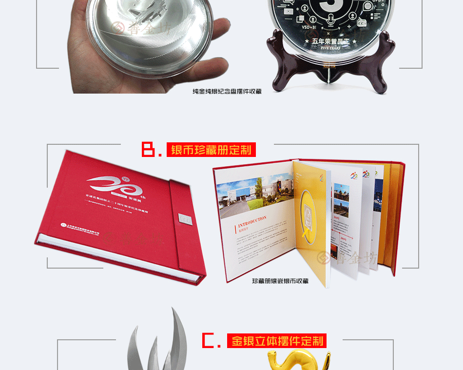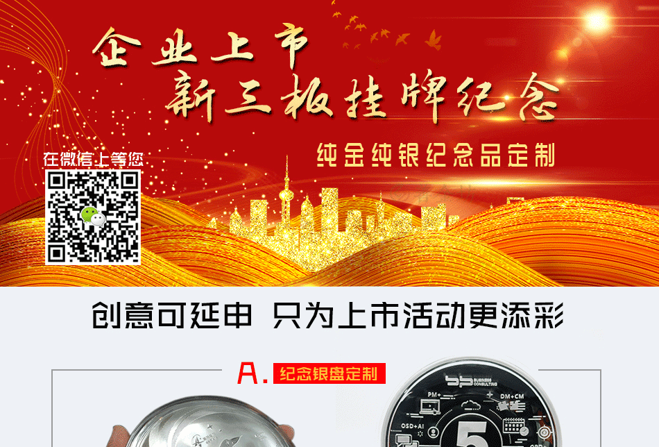 |   以上介紹了幾種有純金純銀的紀念盤可以定制,根據(jù)克重的不一樣可以制作不同直徑的金銀盤,企業(yè)信息賦予正面和背面;還有珍藏冊鑲嵌銀幣,紀念冊可以表達的企業(yè)信息比較多,加一枚銀幣增加投資收藏性;純金純銀的立體擺件可以適用于企業(yè)有的產(chǎn)品模型或是形象吉祥物,精于靈魂產(chǎn)品的傳遞;還有金銀碗,寓意比較好,碗周邊傳達一些相關(guān)信息;最后就是純金純銀紀念幣,結(jié)合常規(guī)包裝盒或是水晶支架或是其他包裝形式等等。 閱后如何,不管是企業(yè)上市,還是企業(yè)周慶慶典活動亦或是其他開業(yè)活動等等,選擇一份合適的紀念品饋贈至關(guān)重要,這中間涉及到每份紀念品的預算,紀念品所攜帶的企業(yè)元素,企業(yè)的精神文化等等信息是否表達到位,贈者與被贈者收納的均是一份喜悅也是一份尊貴。 --------------定制服務熱線:021-34679399 13761061777 張經(jīng)理------------ |