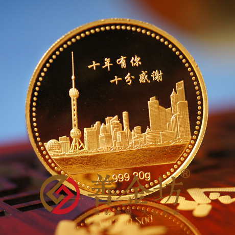 材質(zhì):Au.999 規(guī)格:直徑35mm 克重:20g設(shè)計說明:正面圖案“上海華安創(chuàng)新科技發(fā)展有限公司”、“2003-2013“字樣及10周年紀念標志;背面圖案“十年有你 十分感謝”、“Au.999 20g“字樣及東方明珠圖案。