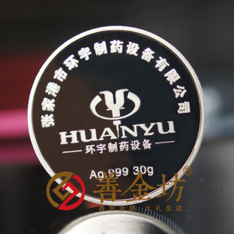 正面圖案:“張家港市環(huán)宇制藥設(shè)備有限公司”、“Ag.999 30g”字樣及公司LOGO;背面圖案:“ZHANGJIAGANG HUANYU PHARMACEUTICAL EQUIPMENT CO., LTD.”、“落成紀(jì)念”字樣及公司大樓圖案。