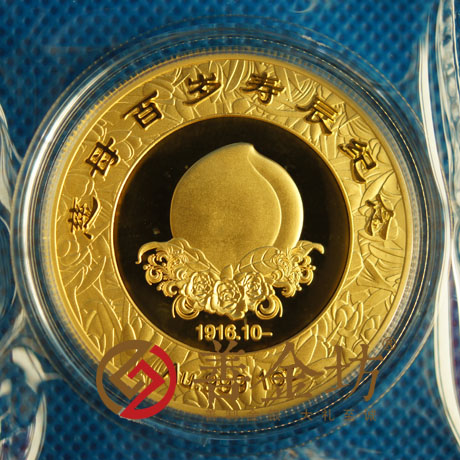 正面圖案:外圈上方鐫有隸書“慈母百歲壽辰紀(jì)念”, 下方鐫Au999 1oz,字間配百合花淡影浮雕;中間為花朵綠葉捧出壽桃圖案和1916.10--字樣。主題,慈恩永懷, 流傳存芳。背面圖案:外圈圍有28個(gè)古體壽字, 中間鐫生肖龍圖案, 上方“吉祥如意”, 下方“公元一九一六年丙辰” 。主題,古樸典雅,以物載情。金章直徑40毫米,成色99.9%,含純金1盎司。