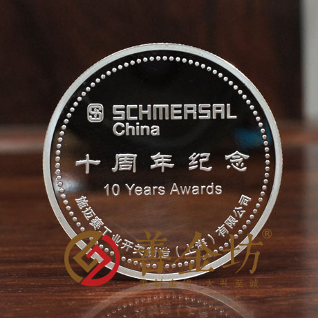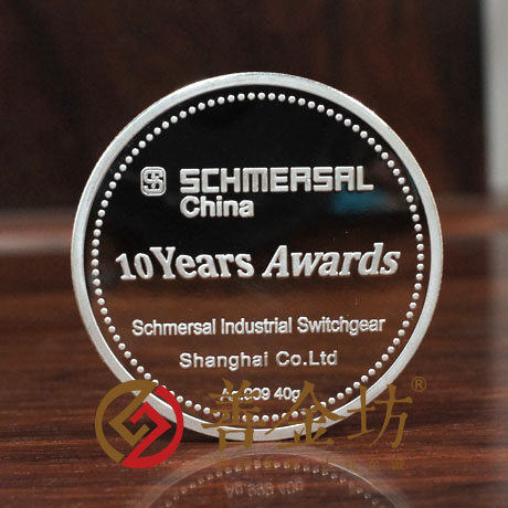 銀章正面鐫有“十周年紀(jì)念”、“10 Years Awards”、“施邁賽工業(yè)開關(guān)制造(上海)有限公司”字樣及相關(guān)圖案,背面鐫有:“10 Yesrs Awards”、“Schmersal Industrial Switchgear Shanghai Co.Ltd”及相關(guān)圖案。銀章直徑40mm,含純銀40克。