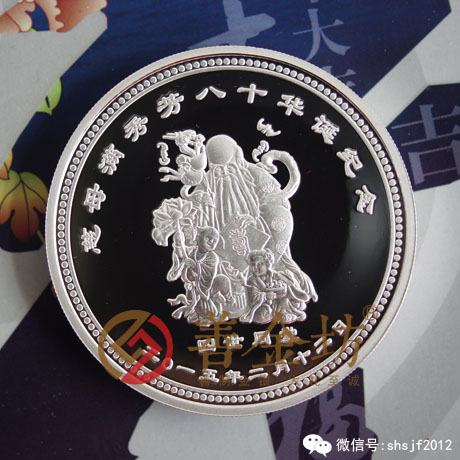 正面圖案:鐫有“慈母滿秀芳八十華誕紀念”、“四世同堂” 、“二0一五年二月十二日”字樣及壽星圖案。背面圖案:鐫有“慈命敬鑄 王洪林、杰、濤、瑞、義”字樣及其他裝飾圖案。銀章直徑40毫米,成色99.9%,含純銀30克。
