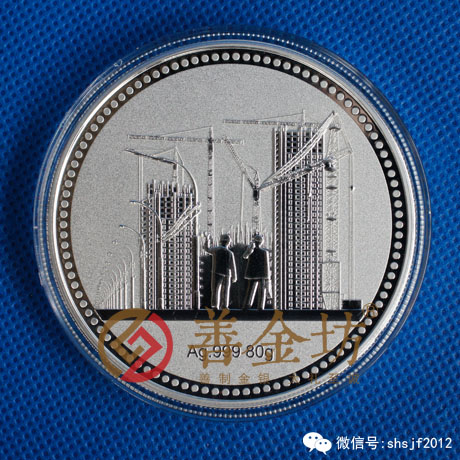 銀章正面:鐫有“豐泰建設(shè)集團(tuán)有限公司 集團(tuán)成立紀(jì)念”、“2015”字樣及公司logo圖案。銀章背面 :鐫有Ag.999 60g字樣及工地施工圖案。銀章直徑50mm,成色99.9%,含純銀60克。