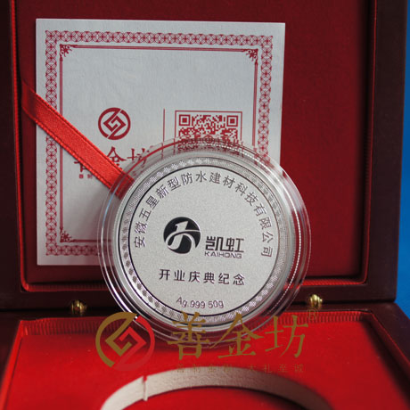 面圖案:鐫有“安徽五星新型防水建材科技有限公司”、“開業(yè)慶典紀(jì)念”、“Ag.999 50g”等字樣及l(fā)ogo圖案。背面圖案:雕刻辦公大樓圖案。