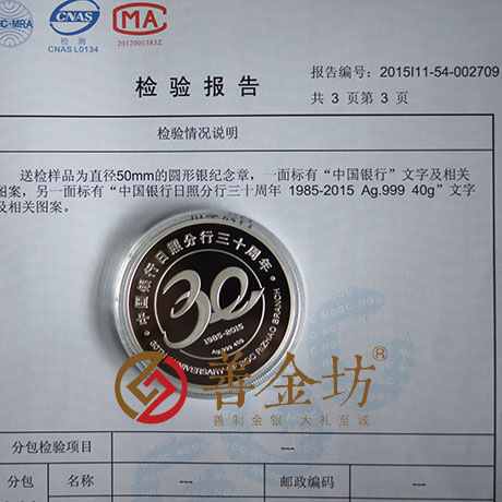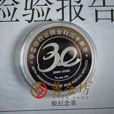為慶祝中國銀行日照分行成立三十周年,特制作銀章以資紀(jì)念。銀章正面為中國銀行日照分行三十周年中英文字樣和由歡慶的飄帶構(gòu)成的“30”圖案; 背面為中國銀行標(biāo)志和長城浮雕。銀章使用40克99.99%千足銀經(jīng)現(xiàn)代造幣技術(shù)精而成,創(chuàng)意新穎,鑄造精美,限量發(fā)型,具有較高的收藏價(jià)值。