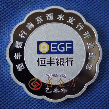 正面圖案:彩印三羊開泰圖案。背面圖案:鐫有“恒豐銀行南京溧水支行開業(yè)紀念”、“乙未年”、“Ag.999 70g”字樣,彩印恒豐銀行l(wèi)ogo。銀章直徑60毫米,成色99.9%,含純銀70克。