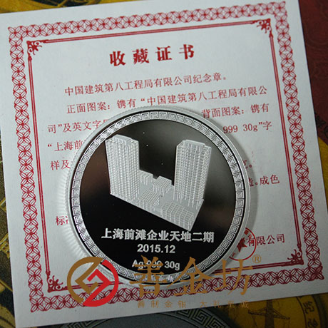 背面圖案:鐫有“上海前灘企業(yè)天地二期”、“2015.12 Ag.999 30g”字樣及大樓圖案。