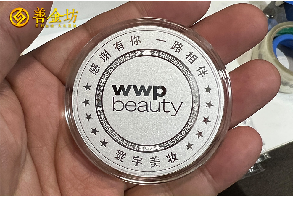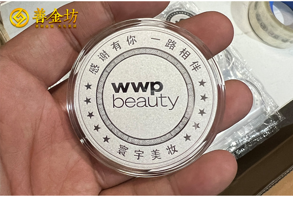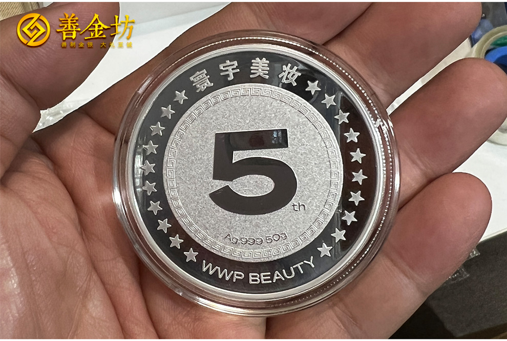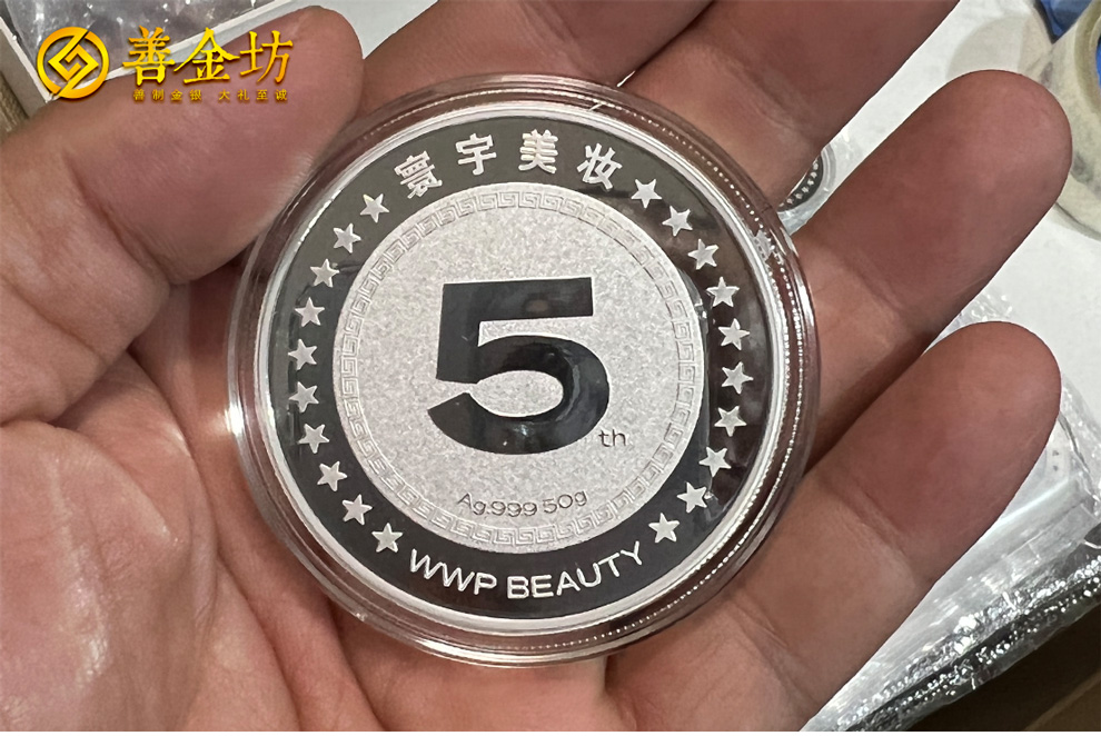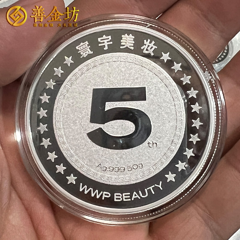 江蘇寰宇美妝員工入職5周年定制純銀紀(jì)念章50克 制作銀章 銀章定做 銀幣定制